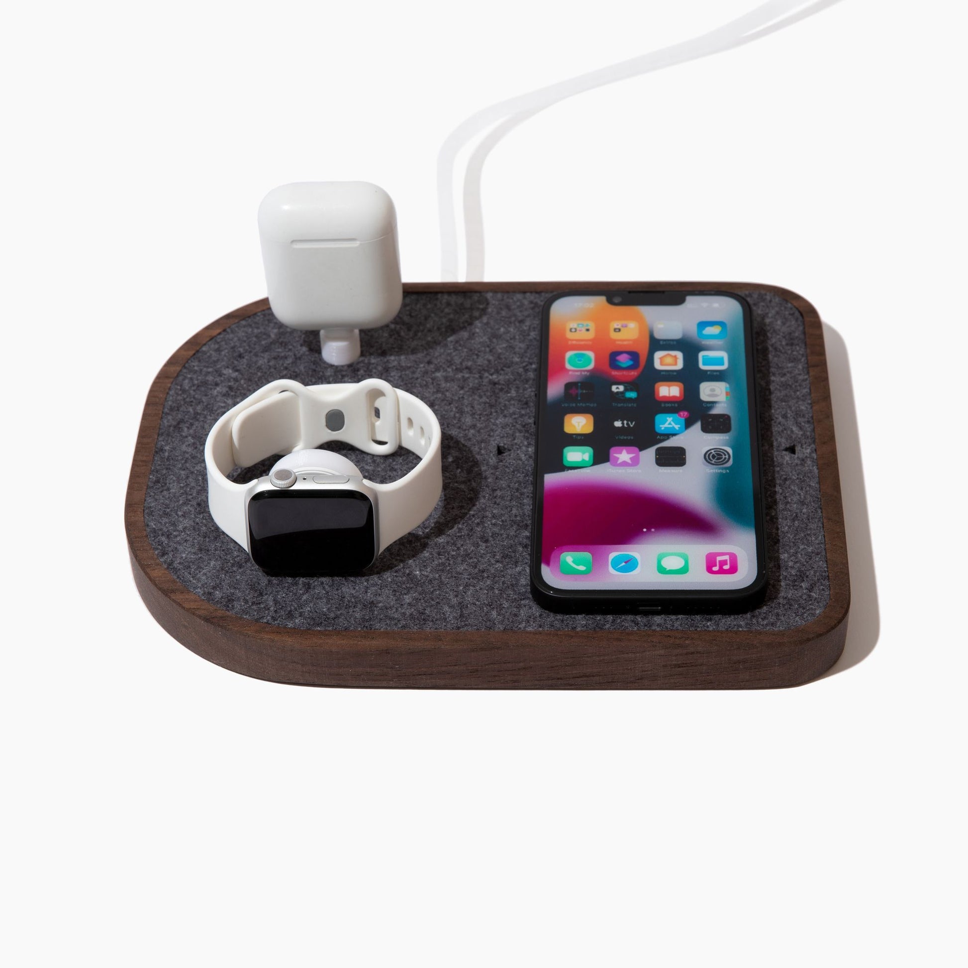 Handmade in USA from a single piece of solid Walnut and topped with soft vegan felt, this docking station will charge a Phone, Watch and AirPods simultaneously. Choose the best configuration based upon your unique devices and needs.