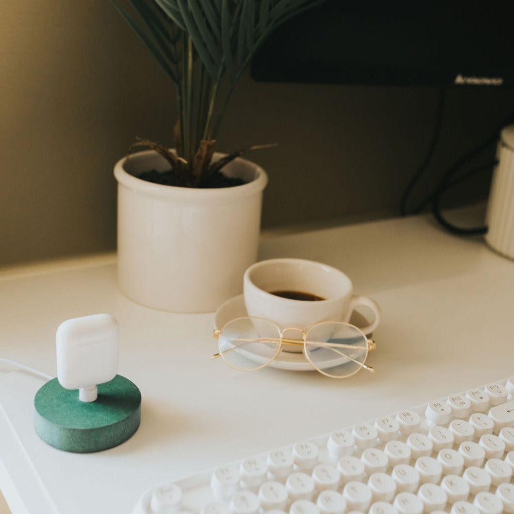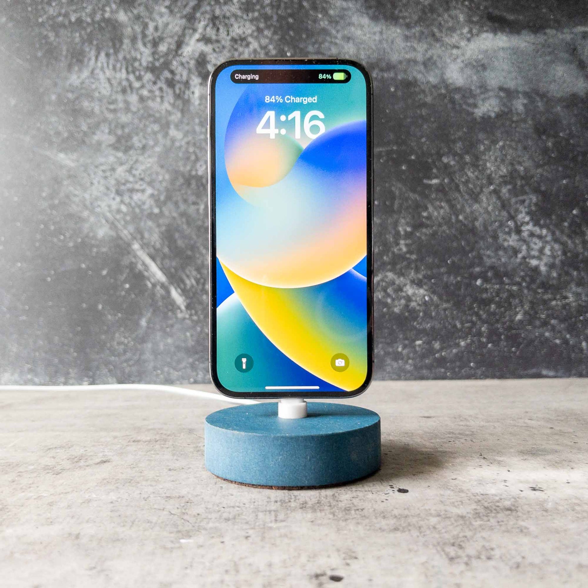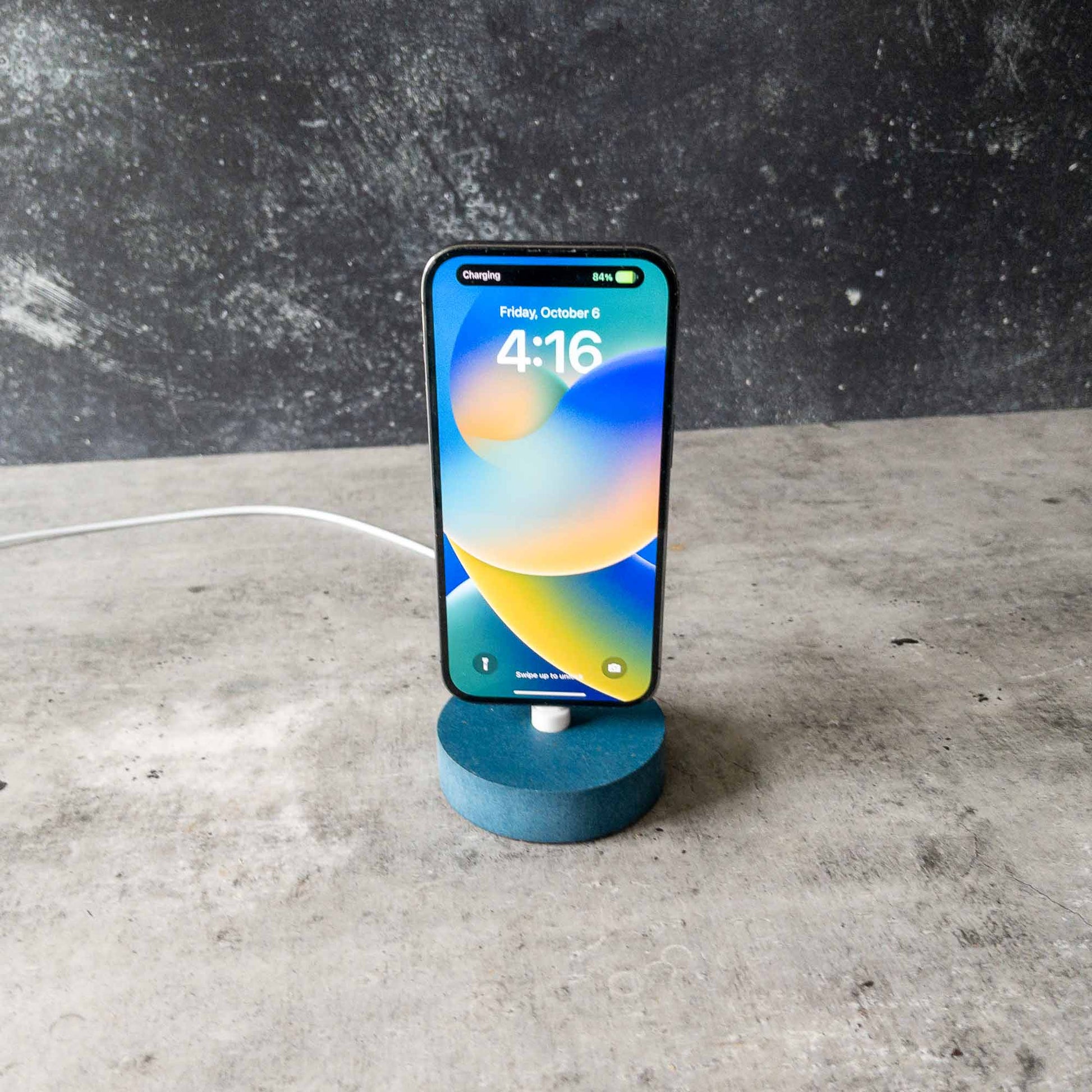 Minimalist design and a tiny footprint make this charging stand the perfect addition to any (every) room in the house. Wired charging guarantees the fastest charging speed for your phone or earbuds. Choose the plug/cable that is compatible with your device. Compatible with phone cases. Power adapter is not included.