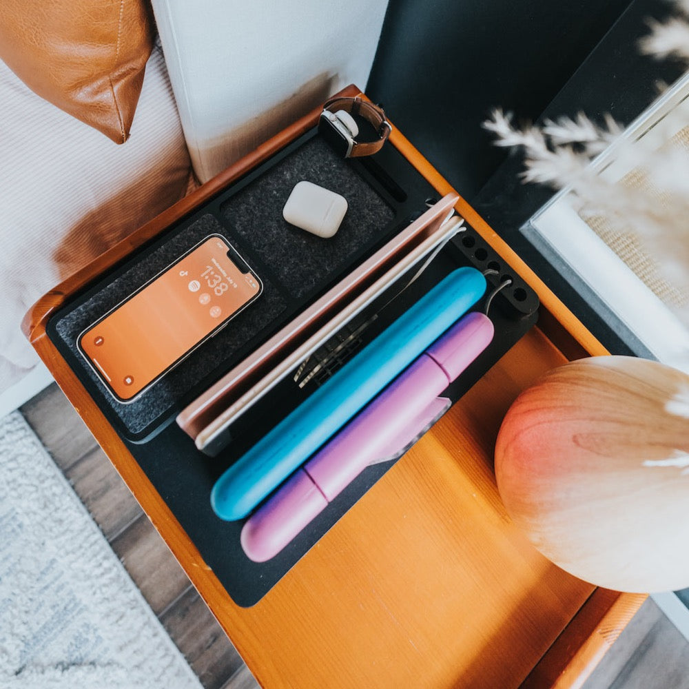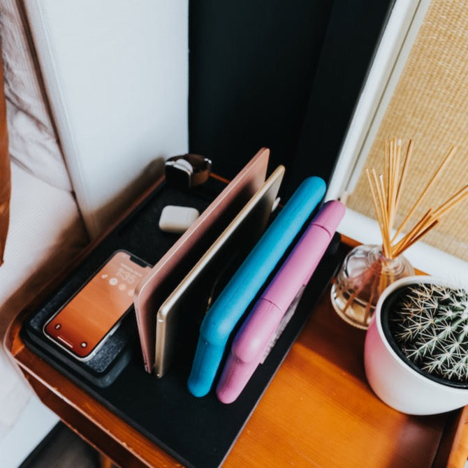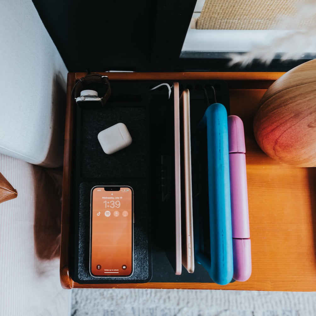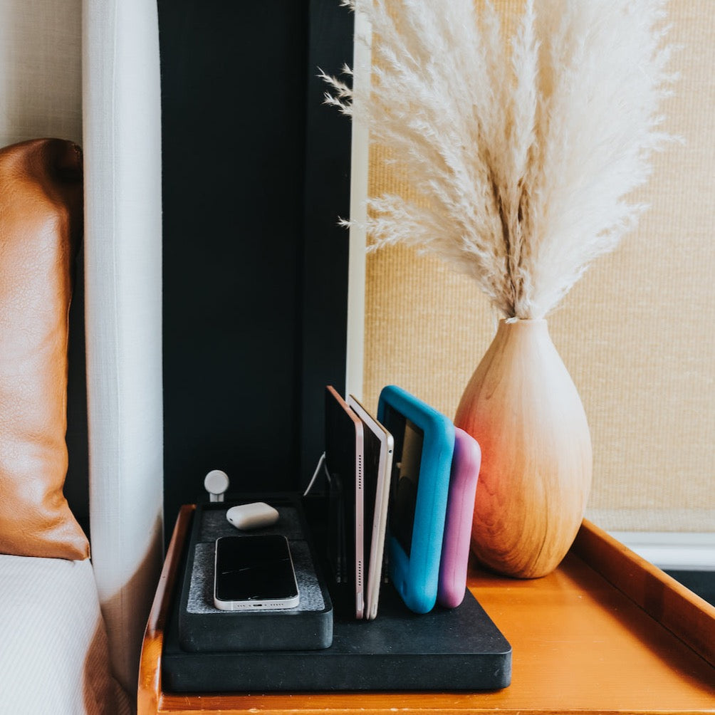 Say goodbye to the clutter of cords and endless plugs and upgrade your charging experience to our Family Charging Station. Charge your entire household's devices in one place and transform the mundane task of charging into a sleek, organized affair. Compatible with any mix of devices (phones, laptops, tablets, watches, earbuds etc.) and needing only one outlet to plug into, it's the perfect addition to any modern home.