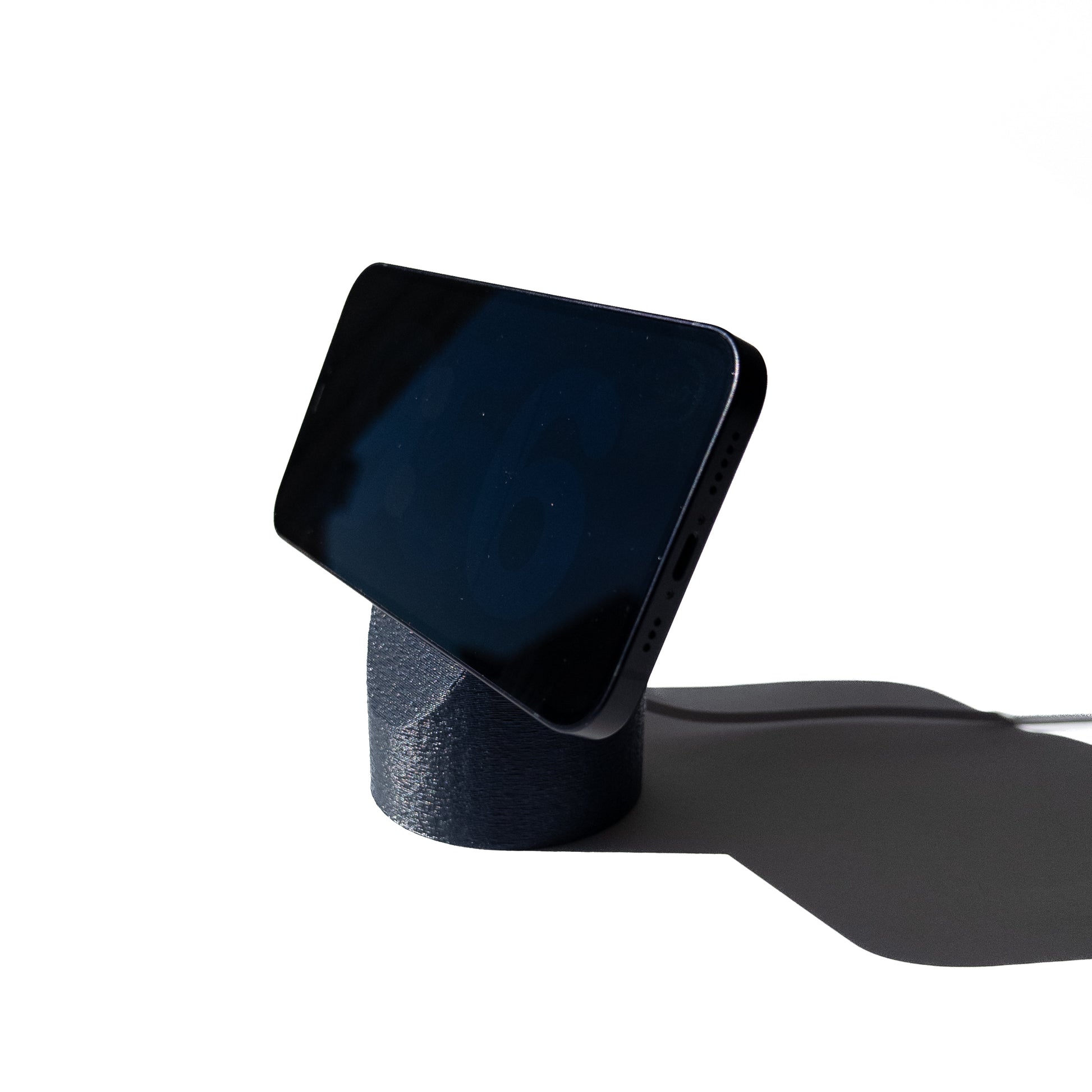 Modern design for everyday charging. This minimalist MagSafe stand transforms the basic charger into a sleek, sculptural accent for your home or office. Designed to fit the Apple MagSafe charging puck, it keeps your phone upright, charged, and ready — whether you’re working, relaxing, or winding down at night.